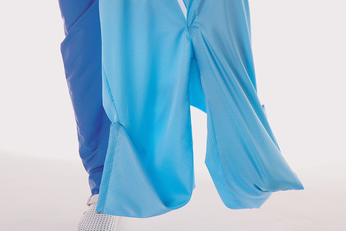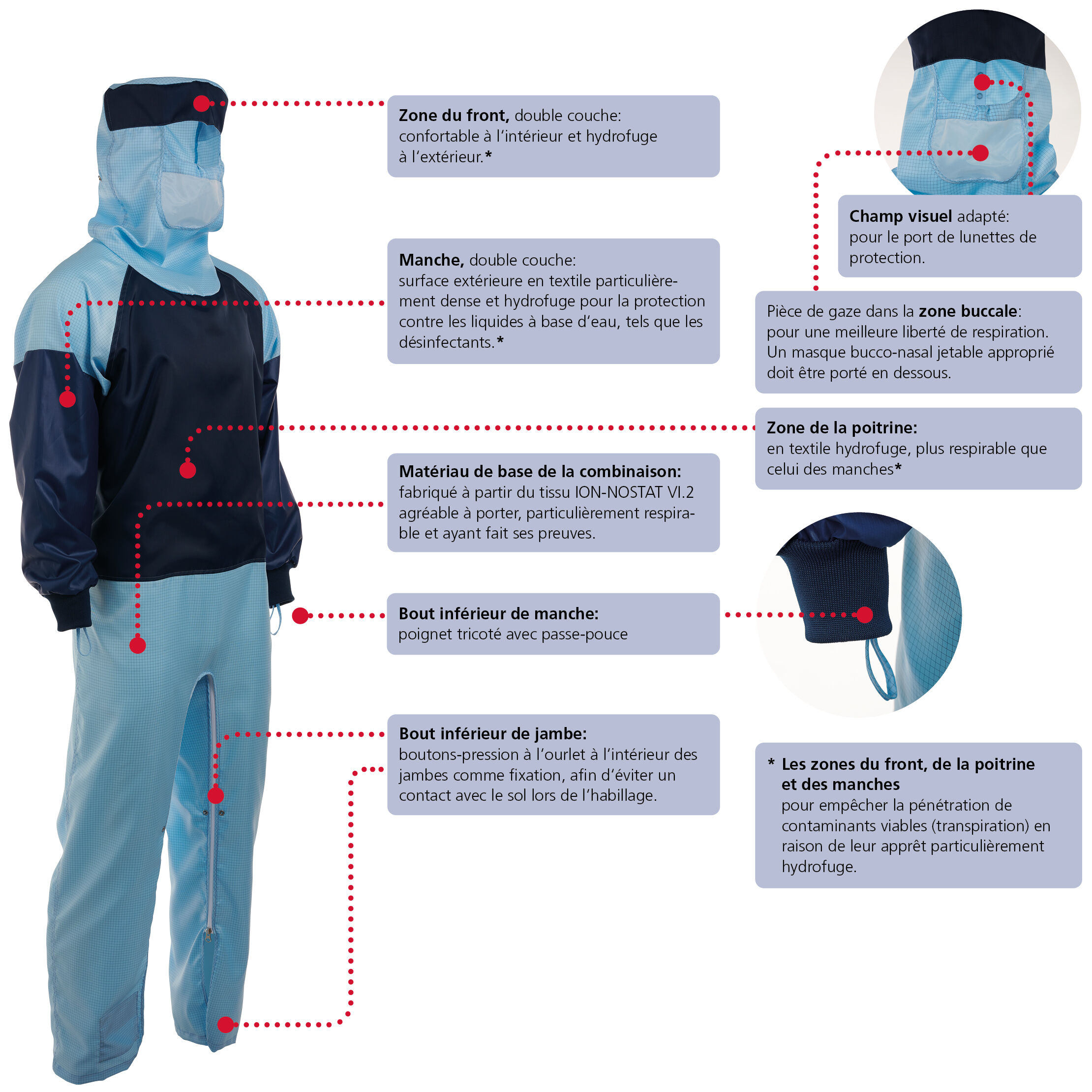 - Boutons-pression pour fixation aux manches / à la taille ou aux jambes de pantalon afin d‘éviter un contact au sol lors de la procédure d‘habillage